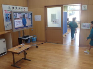 4月30日 眼科検診 4月30日(水)、午後から眼科検診を行いました。検診を受ける次の学年は、保健室前廊下で静かに並んで待ちます。大型モニターには、検診の動き方が分かる動画が流れていますので、待ちながらその動画を視聴しています。児童も動き方が分かるので、スムーズに検診が行われています。 静かに並んで待ちます モニターで検診の流れを確認します 検診中