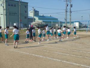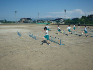 5月1日 児童の様子 5月1日(木)、4~6年生は町体育大会に向けて放課後練習をしました。ハードル走では、ハードルの高さを一番低くして、各学年のインターバルを正式な距離に設定して練習をしました。リズムよくハードルをまたぎ越すことができるように意識しながら走っていました。短距離走のグループでは、スタート時にジャンプしながら一回転してからダッシュするなど、体つくり運動を取り入れながら練習を行いました。