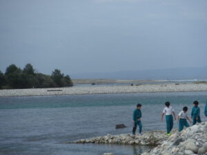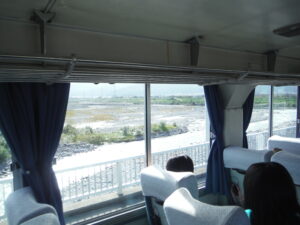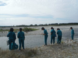 10月7日(火)、5年生は理科「流れる水のはたらき」の学習で、黒部川の上・中・下流の3か所を見学しました。この日は、クマの出没情報があったため、上・中流の2か所はバスの中からの観察のみとなりました。下流では、安全に気を付けながら川のそばまで行き、流れの速さや川幅、石の大きさ・形などを観察しました。今後は現地で見学したことをもとに、流れる水の働きについて学習していきます。