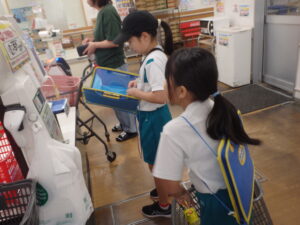 10月15日(水)、3年生は社会科「店ではたらく人」の学習で、校区にあるスーパーマーケット「アルビス入善店」の見学に行きました。自分や家族が買い物によく行く店であるスーパーマーケットでは、働く人がたくさんのお客さんに来てもらうためにどんな工夫をしているのかを、実際に出かけて店長さんにインタビューしたり、バックヤードを見学させてもらったりしました。また、自分で買い物も体験しました。