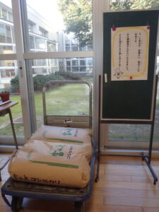 先日、学校に米袋が2つ届きました。これは、4、5年児童が稲刈り体験をした学校田で収穫したお米です。JAみな穂の方々にたくさんお世話いただきました。ありがとうございました。このお米は、給食や家庭科の学習に使わせていただきます。