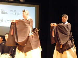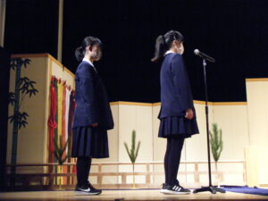 11月18日(火)、文化庁の舞台芸術等総合支援事業として、入善町の小学校5、6年生がコスモホールで伝統芸能である「能」を鑑賞しました。第一部は狂言「盆山」と囃子方の実演と解説、能の役割説明でした。第二部では、謡「千秋楽」をみんなで実演したり、能「黒塚」を鑑賞したりしました。児童にとってはこれまでにあまり経験したことがない能の鑑賞ですが、見所の解説や現代語訳のスクリーン表示もあり、能の素晴らしさを体験することができました。最後に、児童を代表して本校の6年児童がお礼の言葉を述べました。宝生会と影向舎のみなさん、ありがとうございました。