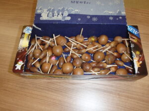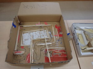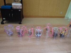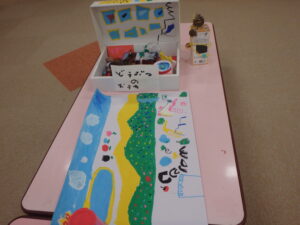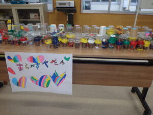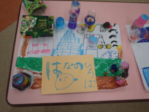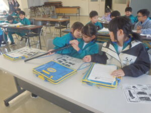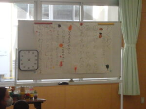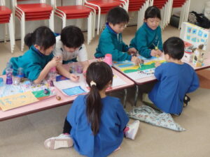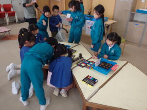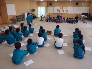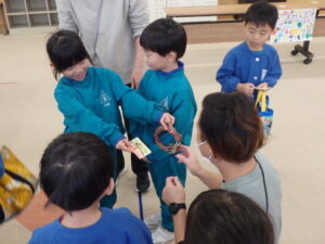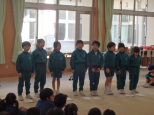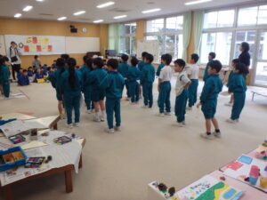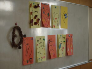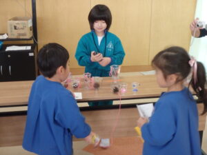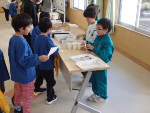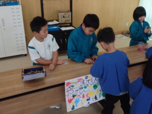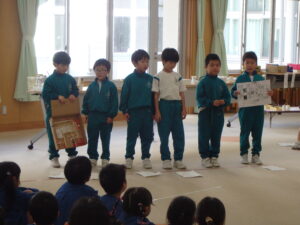 11月19日(水)、1年児童は生活科の学習で「わくわく あきまつり」を行いました。さわすぎ保育所の年長児を招待して、以前から沢スギ等で集めた木の実などを生かして作ったこまやマラカスを使った店で楽しんでもらいました。進行や店の説明等は自分たちで行いました。年長児にも分かりやすいように、実物を見せながら、はっきりとした口調で話すことができました。自分の店を楽しんでくれている年長児を見て、笑顔でがんばっている1年児童の姿がとても素敵でした。