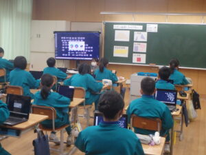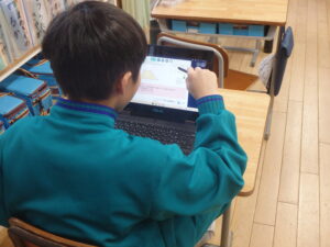 12月5日(金)、5年算数科「面積の求め方を考えよう」の校内研究授業を行いました。この時間は、これまでに学習した長方形や正方形、平行四辺形、三角形の面積の求め方を基にして、台形の面積の求め方を考える学習でした。デジタル教材やワークシート等の自分に合った教材を用いて面積を求め方を考えていました。「同じ台形をつなげると平行四辺形になる」「切り取ってつなぐと長方形になる」等、既習経験を生かして一人一人が意欲的に取り組んでいました。タブレット端末を使うことで、他の人と考えを共有することができるため、悩んだときには参考にすることもできました。