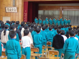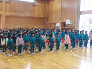 3月4日(水)、卒業証書授与式の全体練習を行いました。今日は前回に引き続き、式に臨むための心構えや基本的な動作(座るときの姿勢、起立等)と、「お別れの言葉」の練習を行いました。各学年ごとに単独や学年全員で呼びかけの言葉を言いました。間を考えながらタイミングよく発言できるように気を付けていました。