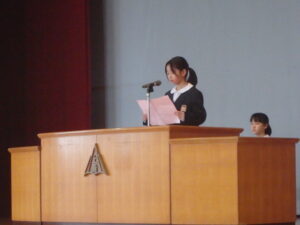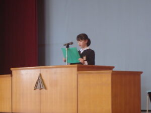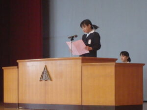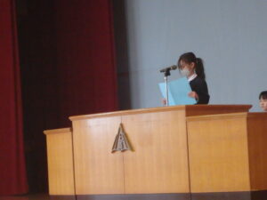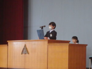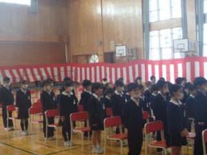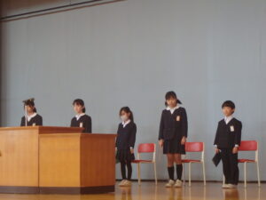 3月24日(火)、今年度最後の「思い出発表会」と修了式、離任式を行いました。「思い出発表会」では、各学年の代表児童が今年度や3学期に頑張ったこと、来年度に頑張りたいことを発表しました。漢字の練習や跳び箱運動等、各自が頑張ったことを話しました。また、進級してもあきらめずに挑戦したいと、力強く話す児童もいました。