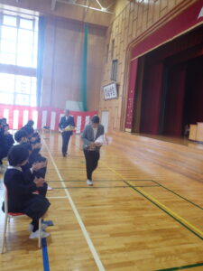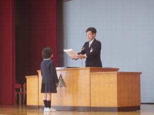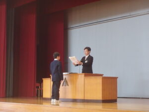 修了式では、各学年の代表児童に修了証書を手渡しました。その後、式辞では自分のためになる充実した春休みを過ごしてほしいと話しました。