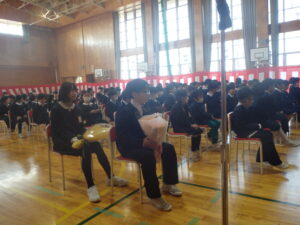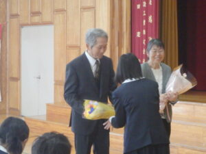 最後に、2名の教員とのお別れの式を行いました。代表児童が言葉を添えて花束を渡しました。