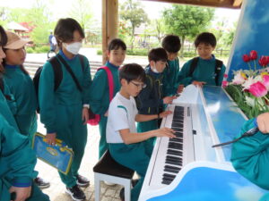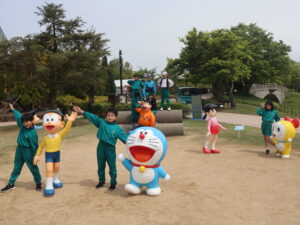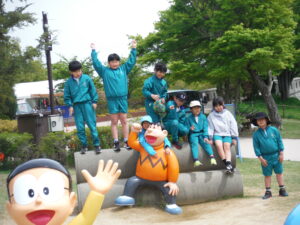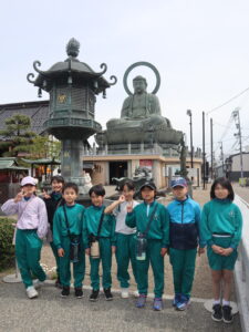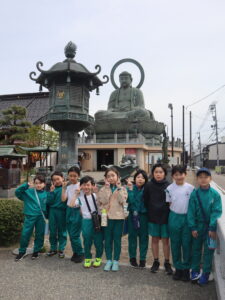 4月24日(金)、3、4年は高岡市にある「ショウワノート」と高岡おとぎの森公園、高岡大仏を見学しました。「ショウワノート」では、学習でもお世話になっている学習ノートの生産について学習しました。高岡おとぎの森公園は、広々とした芝生の広場や大型遊具があり、楽しく体験することができました。また、ドラえもんのキャラクターがあり、自分が漫画やアニメの一部になったような体験もできました。高岡大仏は高さが約16mもあることに驚きました。高岡市にある産業や伝統について、たくさん学ぶことができました。