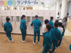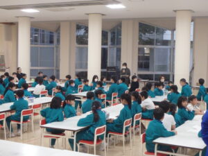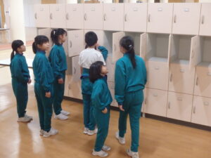11月10日(月)、今朝の「さわやかタイム」は、後期のランチルームでの縦割りグループの顔合わせと給食当番の役割分担でした。今日から新しい座席とグループになります。6年児童が中心となって、配膳の役割や当番時に着るエプロンを入れる棚を確認しました。