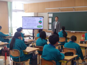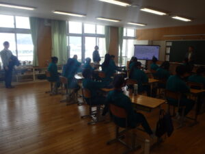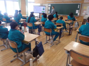 1月23日(金)、6年児童は4限に「ふるさと学習」の事前学習を行いました。入善町教育委員会の田中局長さんと新田川主事さんに来校いただき、入善町の特徴やよさについて教えていただきました。おいしくて豊富な水(湧水)や海洋深層水、養生風力発電など、黒部川扇状地や富山湾を生かした取組がたくさんされていることを改めて理解することができました。来月には、現地学習を予定しています。実際に現地で見学することで、これまで以上に入善町の素晴らしいところを知り、郷土を愛する心情を育むことができると思います。田中さん、新田川さん、ご指導いただきありがとうございました。
