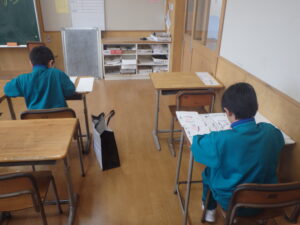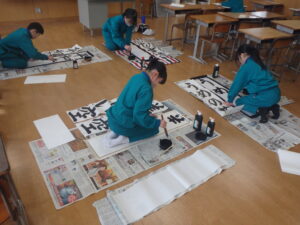 1月23日(金)、昼休みに書初大会の代表による校内書初会を行いました。これまでに数回練習会を実施しました。今日は、これまで練習したことを生かしながら数枚書いた中から一点を自分で選びました。どの児童も字形や大きさ、筆(パス)の運びなど、選ぶ観点をもちながら提出作品を選びました。