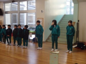 2月13日(木)、3学期2回目の「あいさつ大会」が始まりました。この日は1年児童が担当です。登校してきた児童から玄関前廊下に並んで、元気な挨拶の声を交わしていました。