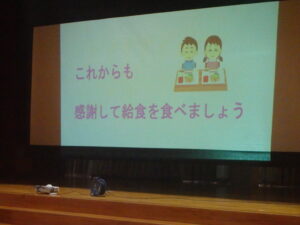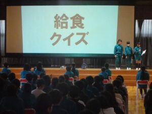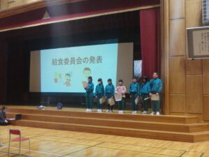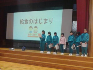 全体練習の後に、給食委員会の発表を行いました。学校給食の始まりや上青小学校の給食に関するクイズをしました。6年児童が小学校で給食を食べる回数は、今日を含めてあと7回になりました。1日1日を充実した学校生活にしてほしいですね。