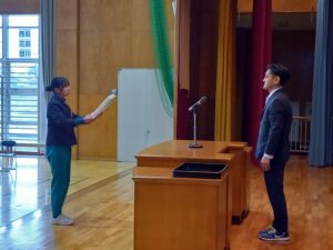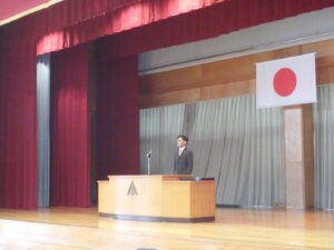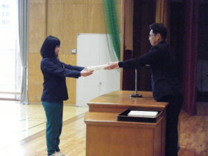3月10日 卒業記念品贈呈式 3月10日(火)、卒業式の全体練習の後に、卒業記念品贈呈式を行いました。入善町及び学校からは国語辞典、PTAからは証書ホルダーを卒業記念として贈呈しました。PTAからの贈呈では、米澤PTA会長さんに来校いただき、代表児童に贈呈しました。