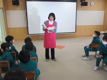 給食委員会が中心となって「給食ができるまで」という題で給食に関わっておられる方の紹介や毎日食べている給食の食材がどこから届いているかについての発表がありました。